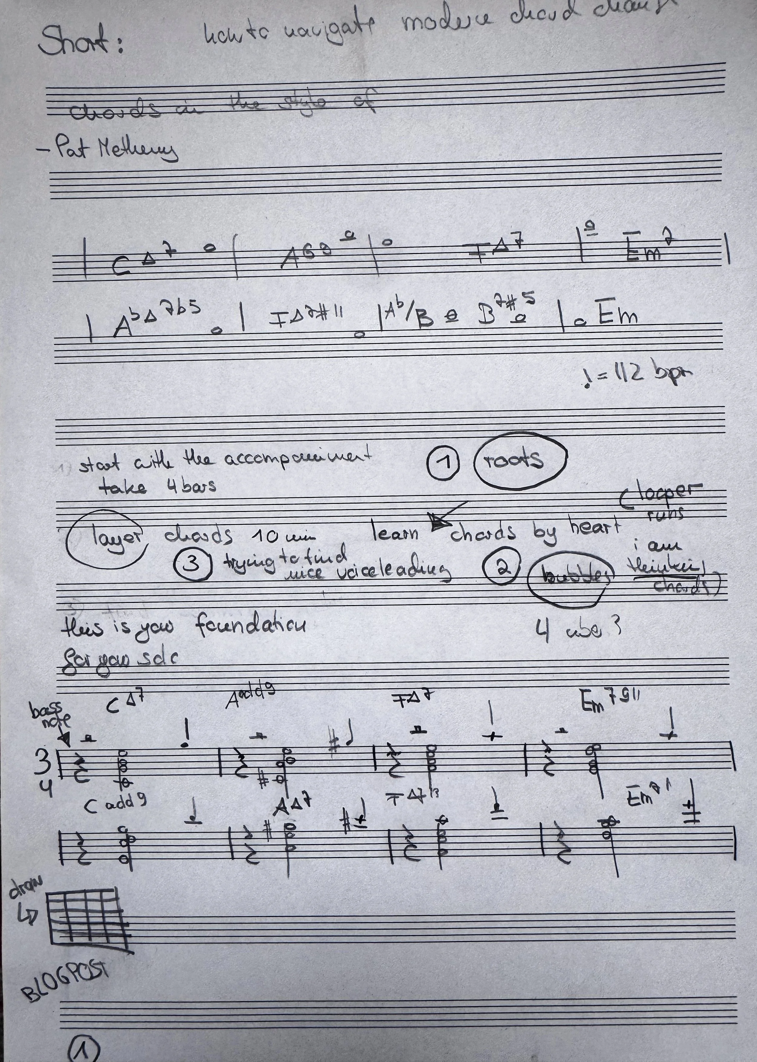 So this morning I also worked on four bars of this Pat Metheny tune, and I think this short is going to be up in the next days. In the second half, I worked on a chord-melody arrangement for “Beautiful Love.” That’s more of a long-term project. I know I can’t do a chord-melody arrangement in one day—I could, but I wouldn’t like the arrangement. First of all, I need to find chords, and it just has to work. I always try to harmonize each and every note. Some passages turn out pretty well immediately, others are more tricky and I harmonize them in a more pragmatic way. Then I come back to the chord-melody arrangement again and again over the next days. I play it the tune by heart, and more often than not I get new ideas for passages I didn’t like, so I’m just rearranging the arrangement over and over again, sort of polishing it. Then I record it. ( takes me longer than i want to admit).
